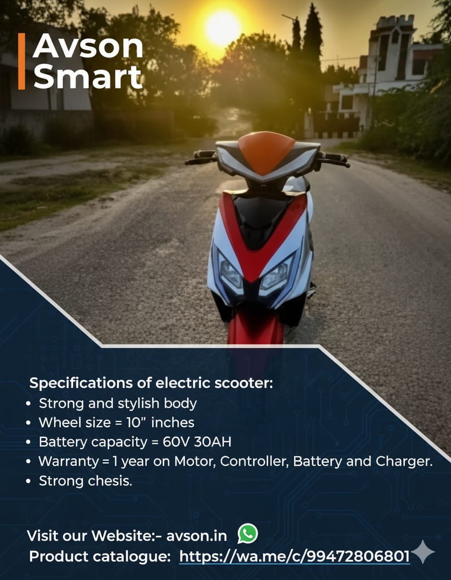 Experience unmatched performance and durability with the Avson Portable Lithium Scooter, crafted for long life and everyday convenience. Designed with branded quality components, it features JK & Eurogrip tyres for superior grip, stylish alloy wheels, and hydraulic suspension for a smooth, stable ride. Enjoy advanced features like remote start, central locking, and reverse gear for easy handling. Built with high-grade materials and a reliable lithium battery, the Avson scooter ensures powerful performance, low maintenance, and lasting value for every rider.
